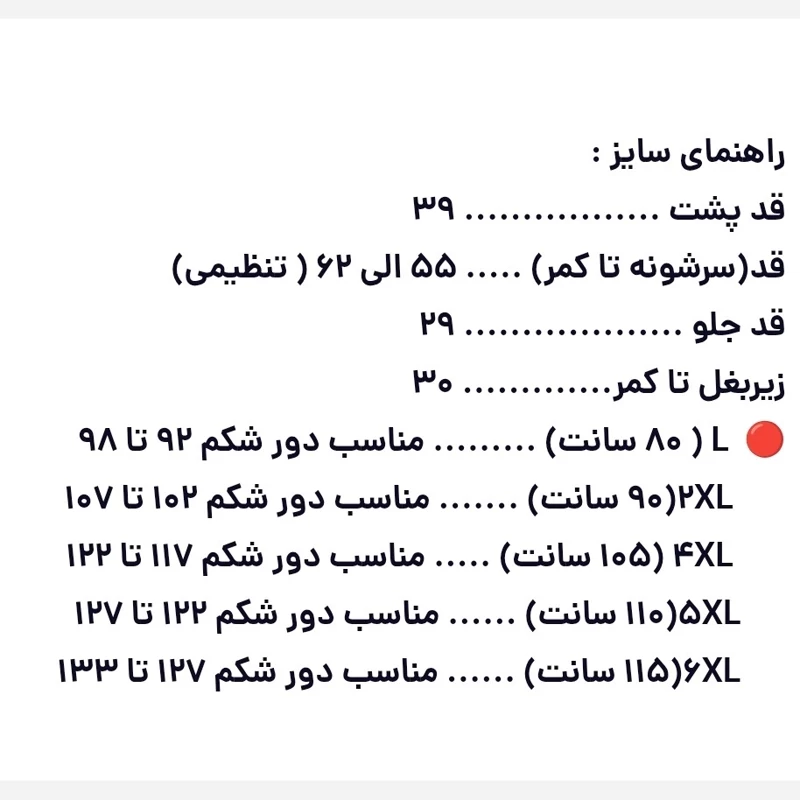 گن ساعت شنی اینبار از نوع تاپی هم رسید🥹 جنس لاتکس طبیعی با لایه داخلی نخ100٪ کتان 👌 25 فنر استیل سه ردیف قزن سرشونه کشی و تنظیمی پوشش کامل شکم ، پهلوها و زیر سینه 😍 سایز بزرگ راهنمای سایز : قد پشت ................. 39 قد(سرشونه تا کمر) ..... 55 الی 62 ( تنظیمی) قد جلو ................... 29 زیربغل تا کمر............. 30 🔴 L ( 80 سانت) ......... مناسب دور شکم 92 تا 98 2XL(90 سانت) ....... مناسب دور شکم 102 تا 107 4XL (105 سانت) ..... مناسب دور شکم 117 تا 122 5XL(110 سانت) ...... مناسب دور شکم 122 تا 127 6XL(115 سانت) ...... مناسب دور شکم 127 تا 133